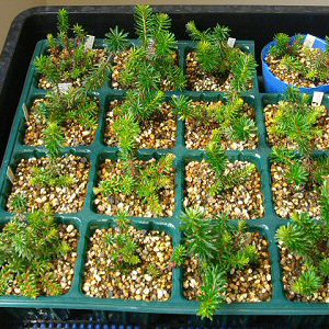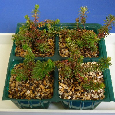 @鹿沼土 A市売の挿し木用用土 [メモ] エゾノツガザクラより難しい。過去にも試みたことがあったが、良い挿し穂を取れず成功しなかった。 そこで今回は実生1の生育株から、元気の良い枝をとり挿してみた。@Aのそれぞれの用土に6本ずつ挿し、両用土共3本ずつ発根し計6本に成功した。 鉢はプレステラ105である。 |