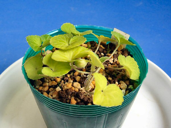 [メモ] 植え替え3か月の状態を示した。この時点で9株中1株に花を咲かせ、4株に貧弱な閉鎖花がもちあがった。 鉢は2.5号(7.5cm)プラポット鉢。なお2009年に入って全て開花している。 |